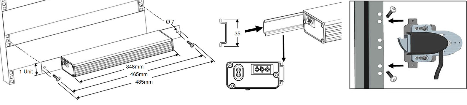 350 mm, avec des angles de fixation pour 19”