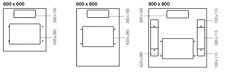 Panneaux bas Panneaux d'acier standard intégrés avec plusieurs trous couverts de 300 x 100 mm et 500 x 115 mm (un de 300 x 115 mm + deux de 100 x 115 mm)